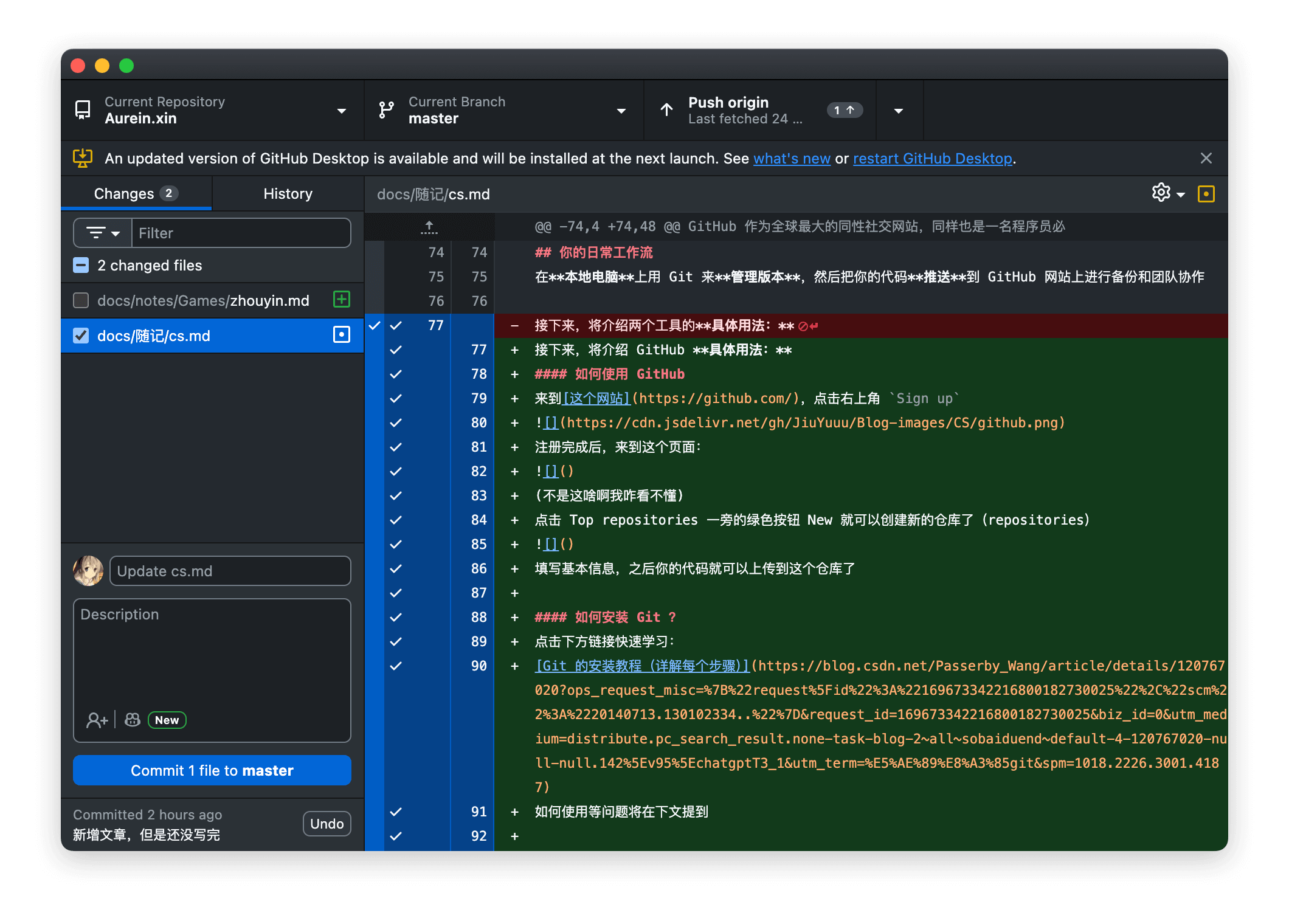 作为一名萌新,面对全是命令行的内容难免会感到无从下手,复杂的 git 命令完全不会敲,文件完全找不到怎么办啊 那么我将向你推荐一个 GUI 旷世神作———— GitHub DESKTOP 通过这个软件,你可以一键 commit 一键 push 到 GitHub,操作简单,十分容易上手,纯 GUI 的操作界面完全适合刚入门的萌新使用。等熟悉了 Git 的基本流程后,再去学习相关的命令行会轻松不少